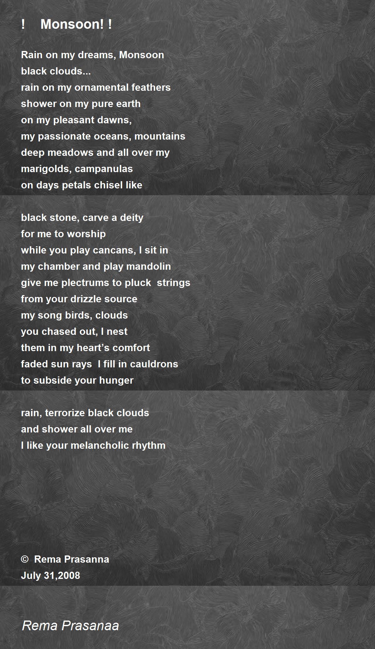 Short Poem On Monsoon Short Poem On Monsoon : The gloomy clouds on a monsoon night… the sky seems so far in the darkest blue.